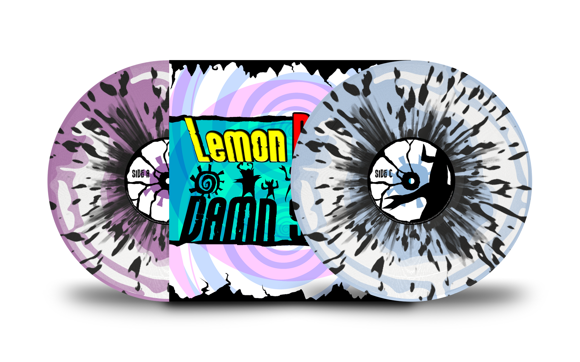 - Violet and blue swirled LPs with black splatter